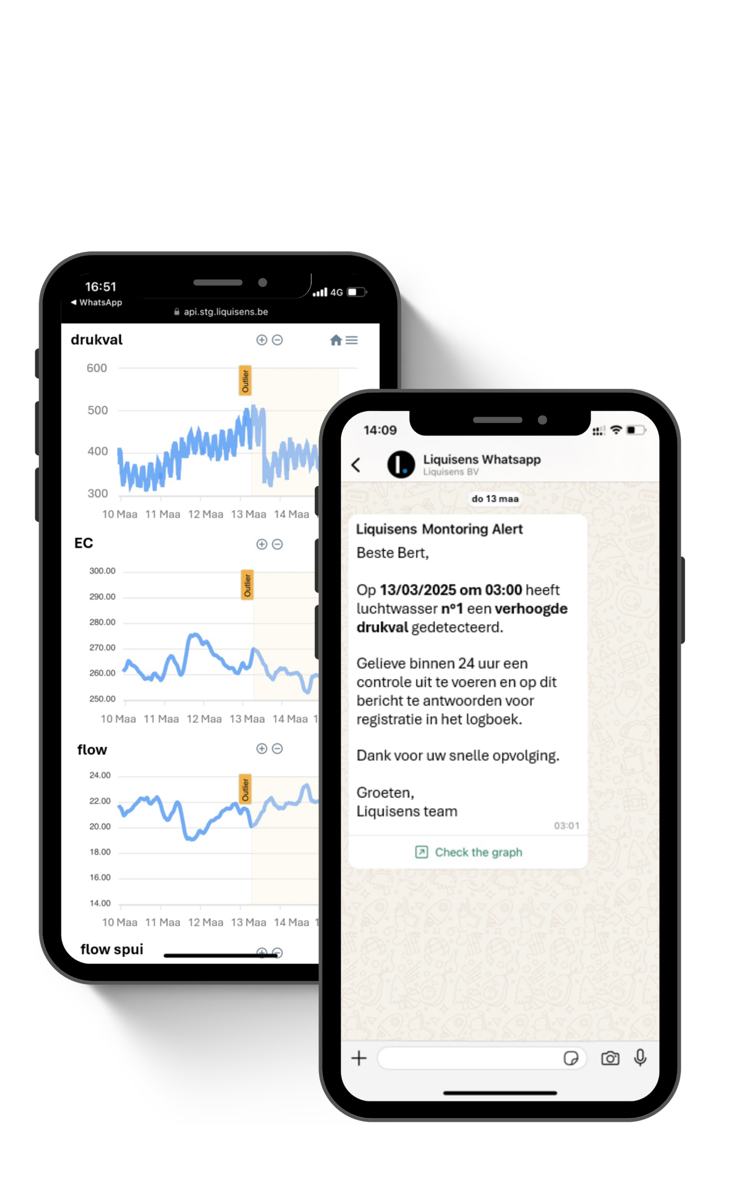 Liquisens analyseert continu de data van uw luchtwasser. Bij een afwijking ontvangt u direct een melding via WhatsApp en/of e-mail.Voor de verplichte registratie binnen 24 uur kunt u eenvoudig reageren met een tekst, foto of ander bewijs. Zo wordt uw interventie automatisch vastgelegd in het logboek.